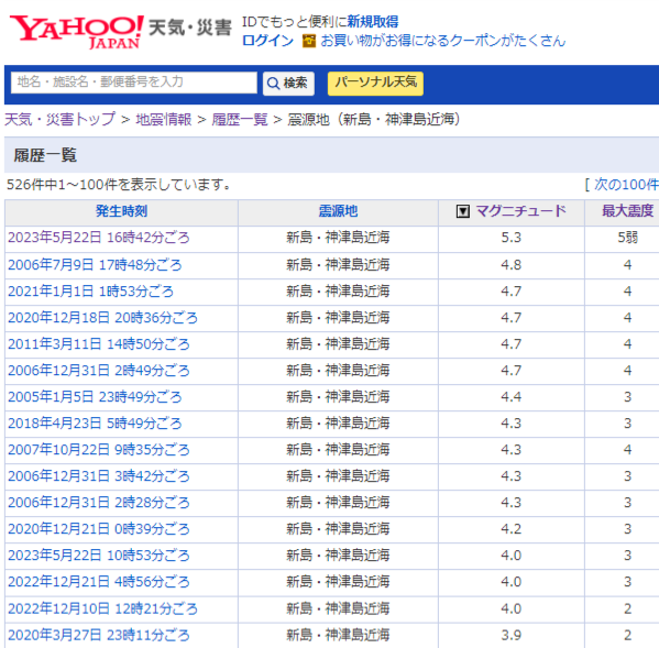 過去の観測では、2006年7月に新島地域でM4.8 震度4を観測したことはありますが、今回の地震がそれを上回る規模であることから、事実上の2004年以来史上最大の地震と言えるでしょう。