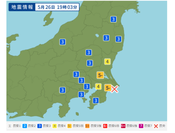 2023年5月26日、千葉県と茨城県で震度5弱を観測する地震が発生し、緊急地震速報も発表されました。